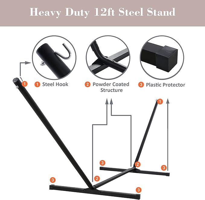 - Freestanding Hammock with Portable Stand: No damage to trees. Created to be stable and long-lasting, the 12 ft stand is made from powder-coated heavy gauge steel. It can be easily assembled in minutes without any tools, and it could be disassembled easily. Feel free to contact us if you have any questions during use within one year of purchase. We are always here to help