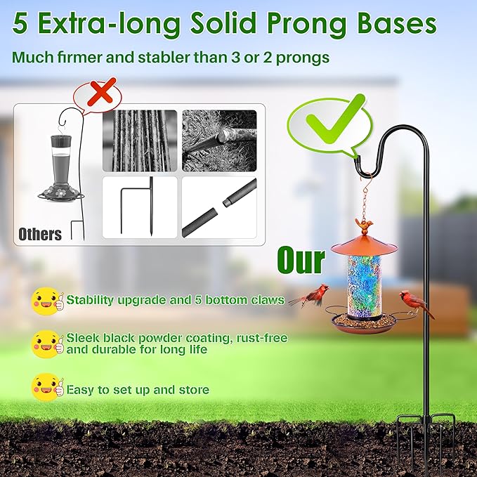 XDW-GIFTS Bird Feeder Pole for Outdoor, 45 Inch Shepherds Hooks Heavy Duty Garden Pole for Hanging Plant Basket, Solar Light Lanterns, Garden Plant Hanger Stands with 5 Base Prongs