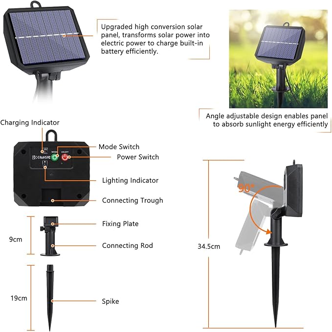 - Easy to Install and Operation: Solar panel with ground stake and wall mounting accessoires, 121ft long string is perfect for wrapping around a tree or wherever you like to light up your garden, patio, lawn, porch, gate, yard, etc. The wire between the first LED light and the solar panel (lead cable) is around 6.5 ft, so you can put the panel in a suitable place.