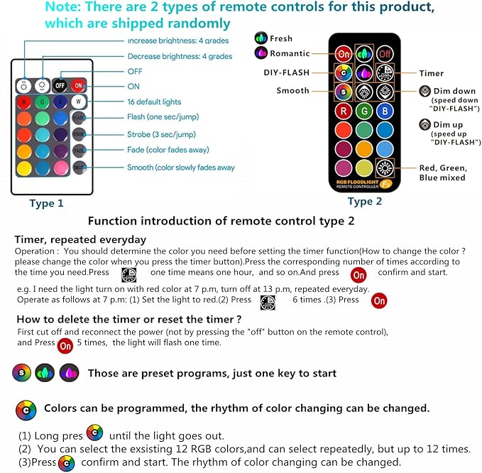 - 12V Low Voltage Landscape Lights:(Light Color is Mixed, NOT Pure RGB) DC/AC 12V Low Voltage Landscape Lighting safe to human body;Input 110V, output 12V; This is a remote controlled and color changing 10W RGB Outdoor Spotlight; In addition to easy operation and brightness adjustment, it also has Smooth mode, relaxation modes, romantic modes, 12 color choice, 24-hour timer function, memory function, 3 dynamic modes, which is very suitable for multiple purposes in life.