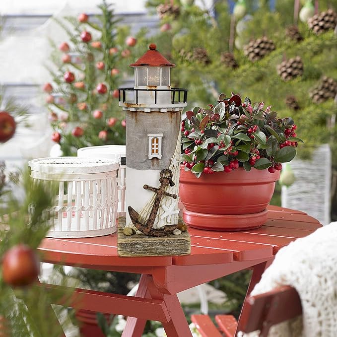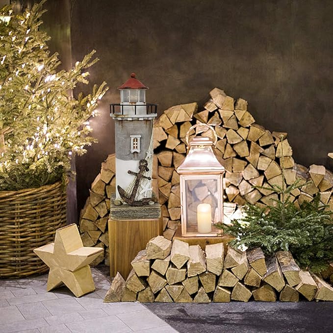 - DIY HOME DECOR: Lighthouse themed decor comes with LED light inside. Requires 2 AA Batteries (Not Included). Auto timer function supports 6 hours on and 18 hours off, used for lightnight. You can wrap the lighthouse statue with string lights for enhanced interest. It also has perfect size and weight to place on a nautical wreath.