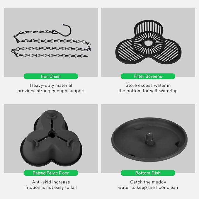 - Flow Design: The water filtration system from top to bottom can effectively save and retain moisture; Meanwhile, the bottom is equipped with a bottom dish that will not stain the ground