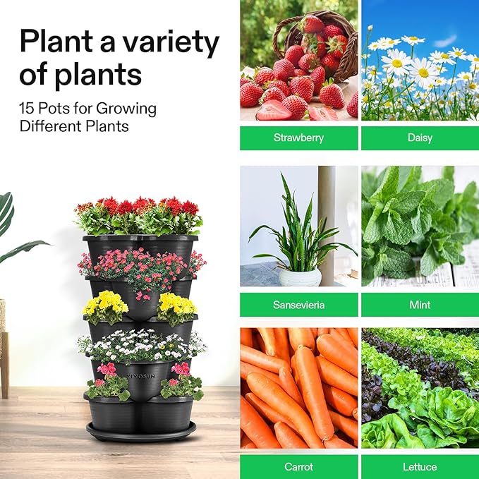 VIVOSUN 5 Tier Vertical Gardening Stackable Planter for Strawberries, Flowers, Herbs, Vegetables, Black