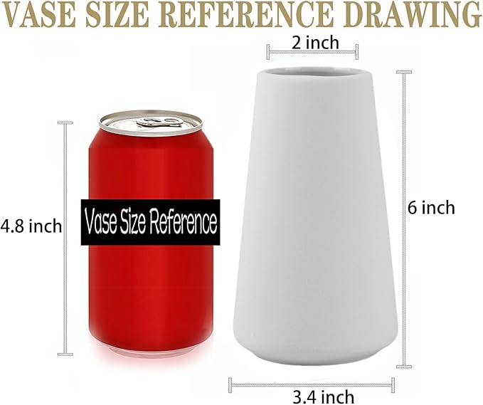- Vase size: (6"H x 3.4"W base) with 2" opening. This decorative ceramic vase is about 6 inches tall, 2 inches in diameter at the top and 3.4 inches at the bottom. Perfect for supermarket bouquets or 11-20" artificial stems.