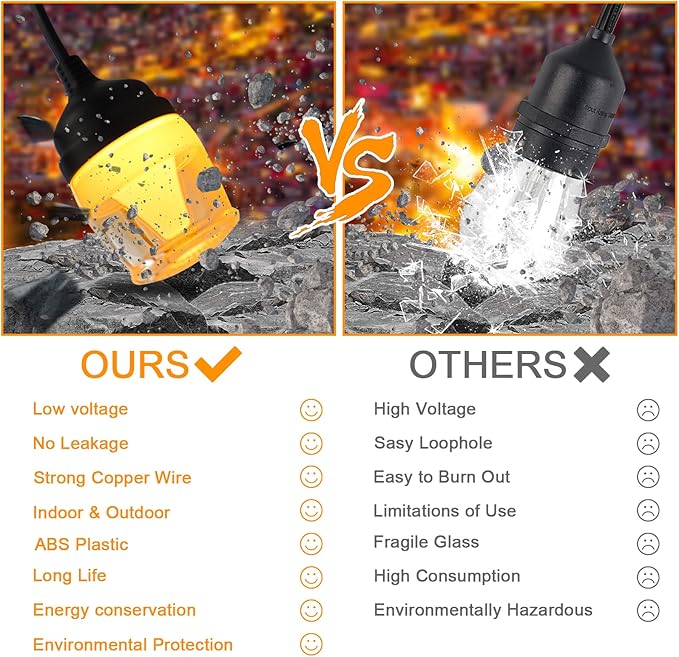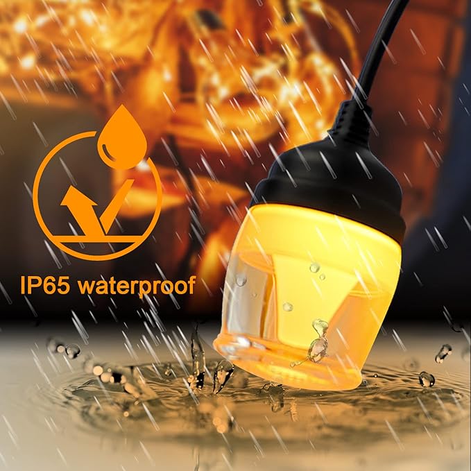 - 【SHATTERPROOF AND WEATHERPROOF】Compared to traditional glass bulbs, plastic bulbs ensure the safety of you and your family which won't break if dropped and without the worry of glass shards. IP65 waterproof patio lights and insulation material can protect led string lights from hot winter, sun, wind, rain, snow and damp.