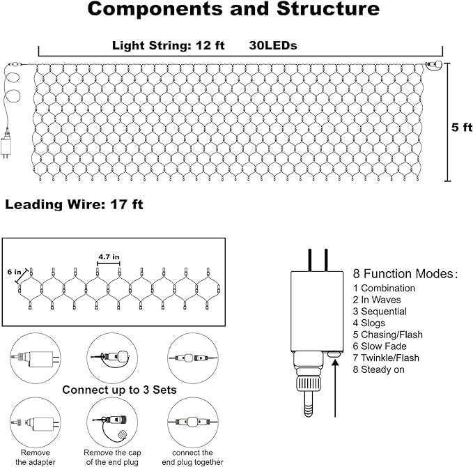 - Easy to Use: 30V Low output adapter ensure the safety, just plug in and unplug it for power on and off. The strong construction makes it tough and sturdy, not easy to damage and keep at a low temperature state after long hours of usage. The attractive mesh lights will bring you a different visual experience, please enjoy the fun of this charming net light.