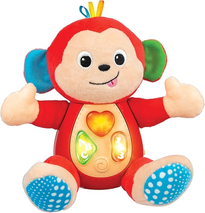 - This adorable monkey stuffed animal is equipped with 3 buttons that light up as the toy sings. The lights are mesmerizing and can be used to distract an upset child.