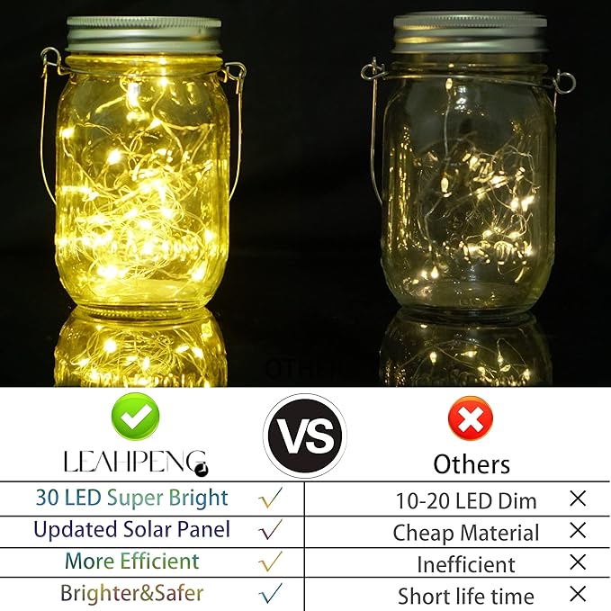 - ✨Mason Jar Lights - SmilingTown’s New Upgraded 10 Pack 30 LED solar mason jar Lids string Lights ,lights up more effective and Fits for most regular mouth mason jar,Decoration for weeding, patio,garden, party,photograph. (10 Hangers Included but Jar Not Included)