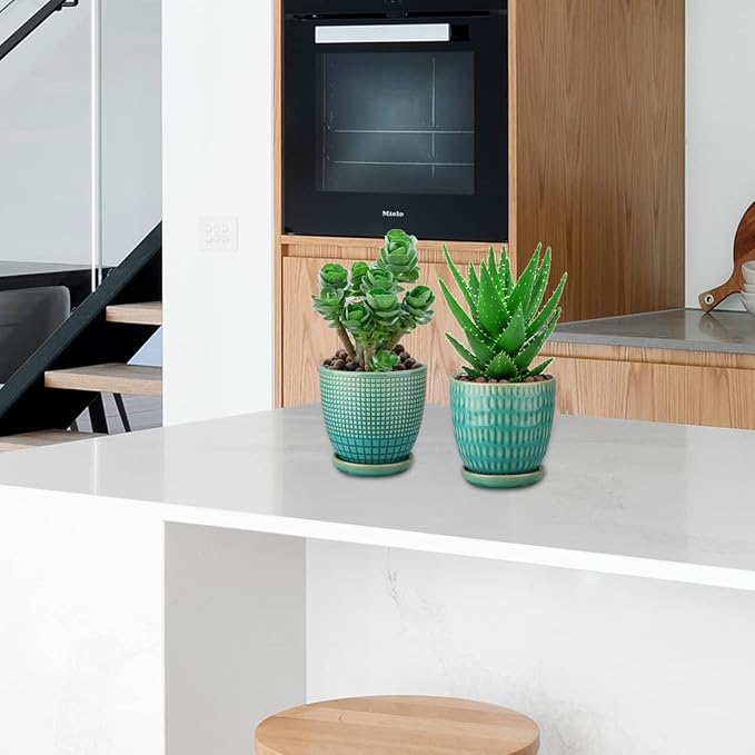 - 【4 inch Pots for Plants】:The shape of the green ceramic planters for indoor plants adopted a tapered design, carving 3 types different geometric patterns on each surface of the flowerpot, which makes it exquisite and special, it is fits for any home/office decor