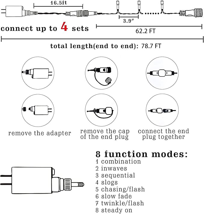 - Series Connection: The length between the bulb is 3.9 inch, lead wire is 16.5 Ft, TOTAL length is 78.7 FT. Each fairy lights is designed with male and female connector, could be connected up to 4 sets together enough for more wide using.