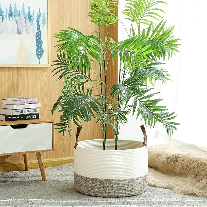 KAKAMAY Large Blanket Basket (20"x13"),Woven Baskets for storage Baby Laundry Hamper,Cotton Rope Blanket Basket for Living Room, Laundry, Nursery, Pillows, Baby Toy chest (White/Beige)