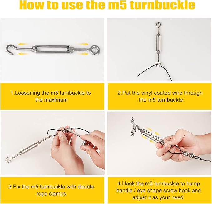 - ENOUGH OUTDOOR ACCESSORIES: KINSNG outdoor lights hanging kit’s package include 1pcs 250ft nylon-coated stainless steel cable; 1pcs cross screwdriver; 1pcs spanner; 1pcs product installations; 4pcs turnbuckles(m5 OC); 4pcs eye bolts; 4pcs large expansion pipes; 6pcs spring clasps; 10pcs hump handles; 12pcs double rope clamps; 20pcs small expansion pipes; 20pcs square head screws; 100pcs black twist ties.