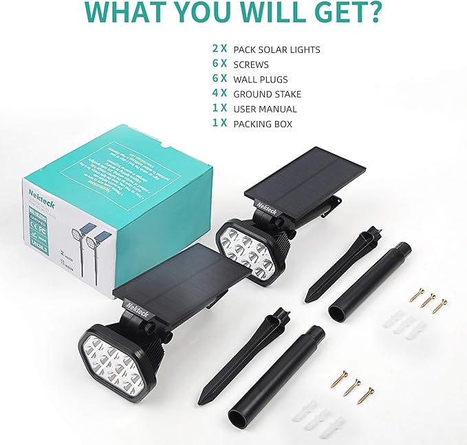 - IP66 WATERPROOF TECHNOLOGY: Through continuing to improve our technology and products, Nekteck 10 Led solar spotlights outdoor are made of high-quality plastic that allows them to withstand rain, snow, frost, or sleet; With an IP66 rating, Nekteck ensured that 10 Led solar landscape lighting long-lasting performance to light up your places all year round