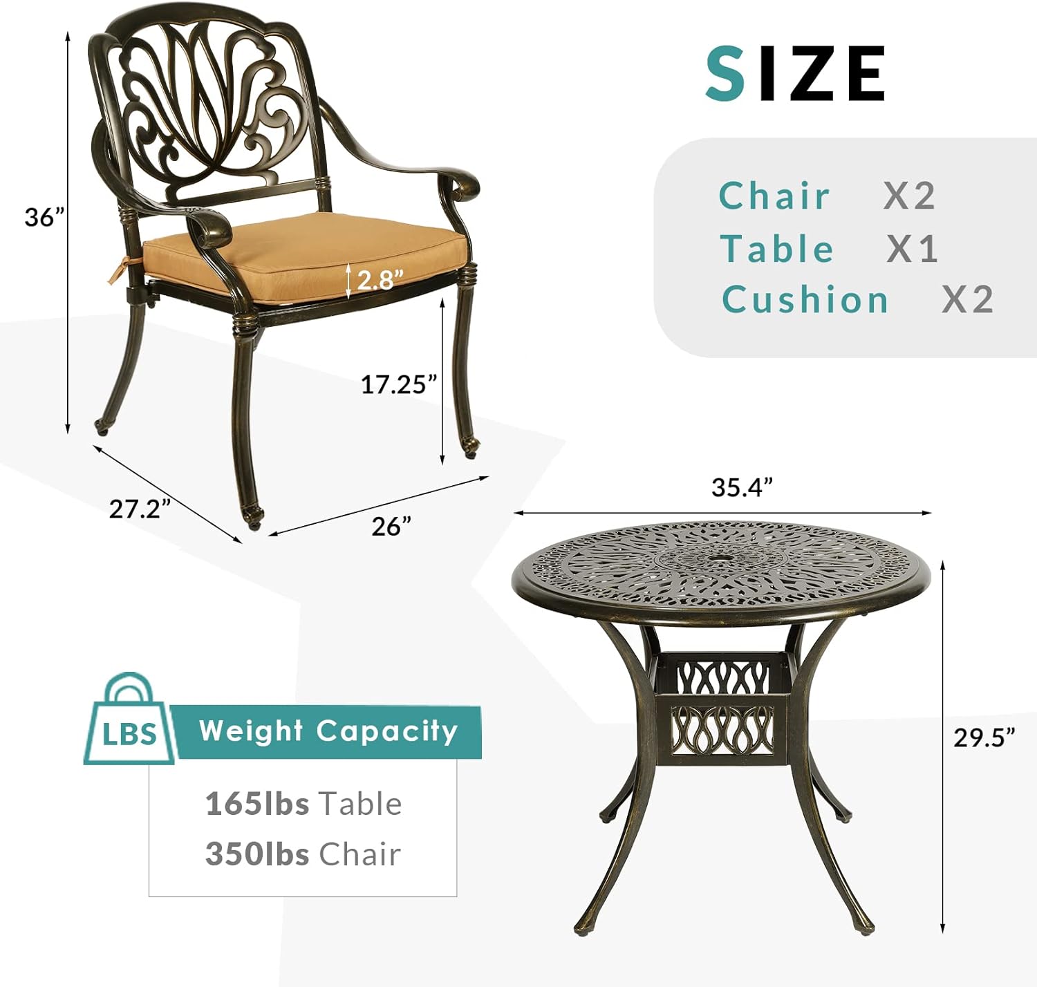 - ALL-WEATHER, RUST-RESISTANT DESIGN: This beautiful 3-piece patio dining set is made to last with all-weather, rust-resistant cast aluminum to endure any weather