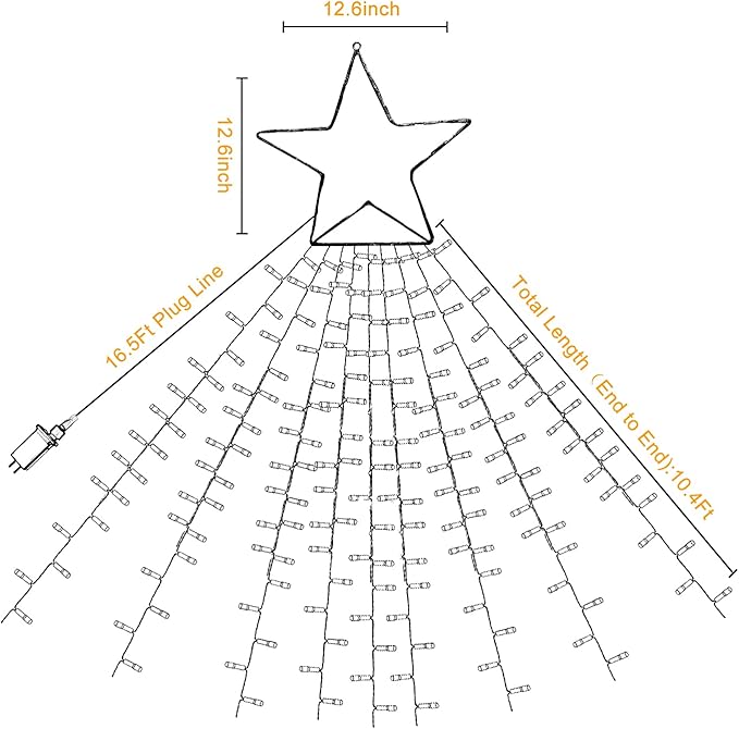 - 【320 LED Christmas Star Lights】Christmas lights decorations are made with super bright 320 LEDs, consisting of 9 string lights of 32 led each. The top star diameter is 12.6in. Each string drops 11.5ft. The plug cable length is 16.4ft. Light up your house or yard, bringing you into a fairy world with starry lights, creating a cozy and festival mood for your home.