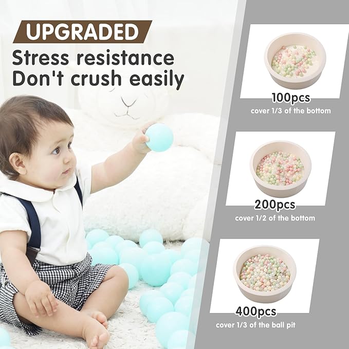 - BABY APPROVED Plastic Balls For Ball Pits :The plastic balls toys are made with lead-free& non-toxic material. No plastic smell. Round balls measuring 2.16 inches in diameter, nice size and safe for babies, prevent suffocation by accidental swallowing.