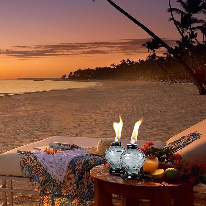 - LIGHT TORCHES PACKAGE INCLUDED : Our citronella light torches package contains 4 minimalist glass desktop torch lights, all with fire cap and wick, no need to assemble. The small and unique design style is suitable for gardens, parties, lawns, patios, homes, outdoor table decorations for patio etc.
