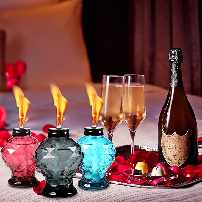 - EXQUISITE GLASS COUNTERTOP TORCH : The total height of the glass torch light with the cover is 6.3 inches, and the transparent glass jar in 4 colors of transparent, black, blue and red can be used as a delicate desktop decoration. The diamond-like cut surface reflects better lighting. table torches outdoor perfect for creating beautiful lighting and party vibes when gathering with friends or having a BBQ.