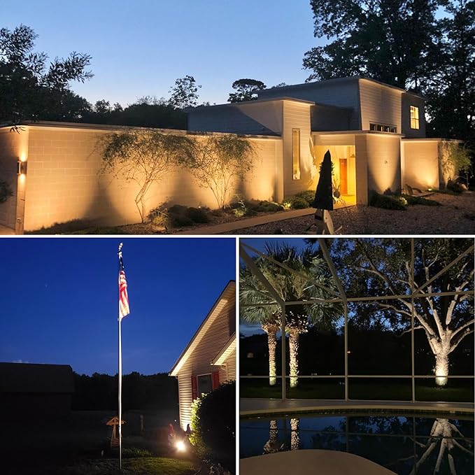 - 【20W Ultra Bright COB Landscape Spotlight】2000 Lumen brightness, 3000K warm white, 60°beam Angle and 270°adjustable light. Widely used in your landscape lighting. Great for illuminate your house, yard, tree, flag, garden, pathway, fence, decorations, etc.