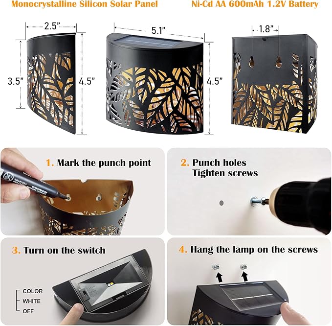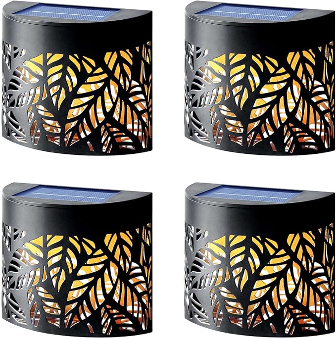 DenicMic Solar Wall Lights Outdoor 4 Pack Fence Solar Lights Led Waterproof Deck Lighting for Patio Pool Step Front Door, Metal Leaf Fence Decoration, Warm White/Color Changing