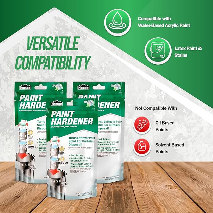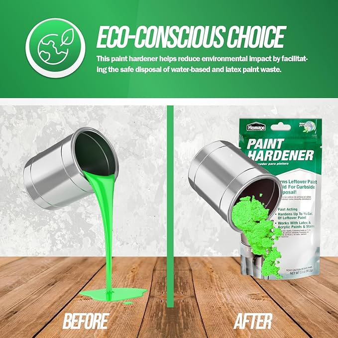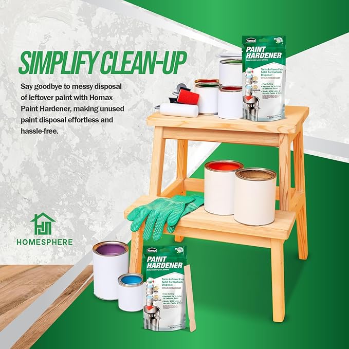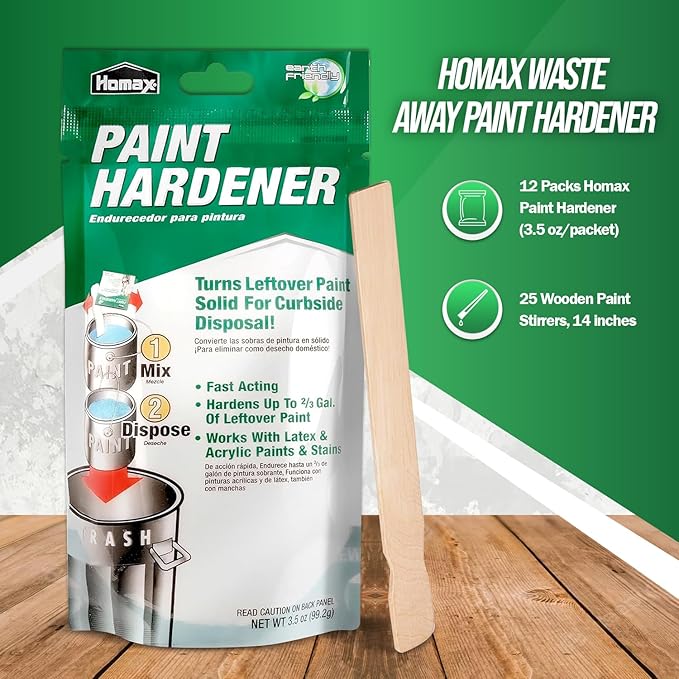 - Effortless Paint Waste Clean-Up – Say goodbye to messy liquid paint waste. Our paint disposal hardener simplifies the clean-up of leftover paint, without the need to use kitty litter, newspaper, or sand, making it safe to dispose of and leaves your working space clean and organized. Our set comes with 12 packs of Homax Paint Hardener in 3.5 oz each packet.