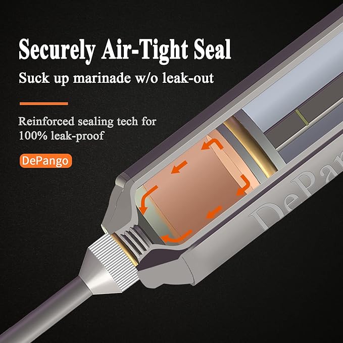 - Comfy To Grip, Effortless To Inject: The plunger of DePango turkey injector is engineered with ergonomic fingertip-sized width and thumb-sized D-ring, comfortable to hold up and easy injection for adults, even arthritic elders; Slip-resistant handle works well for when fingers are wet or greasy; Works well on meat and poultry, like steak, beef brisket, turkey, chicken breast, pork chops, london broil, boston butt, lamb and duck
