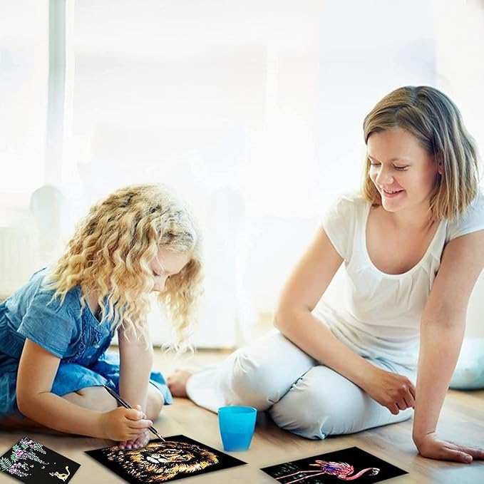 - Super Value Set: Package includes 8 sheets scratch paper cards(29*21cm), 4 sheets scratch postcards(20*14cm), 1 scratch pen, 1 repair pen, 1 clean brush, 3pcs wooden sticks.