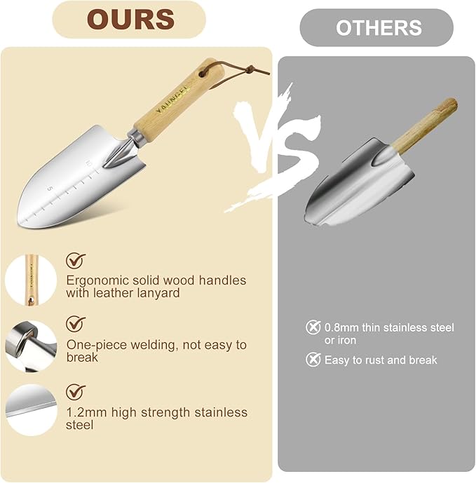 - Comfortable Handle - The gardening kit handle made of ash wood fits easily in your hand and will reduce hand pain and fatigue while digging, weeding, and planting. Handle bottom designed with cowhide lanyard for easy storage.