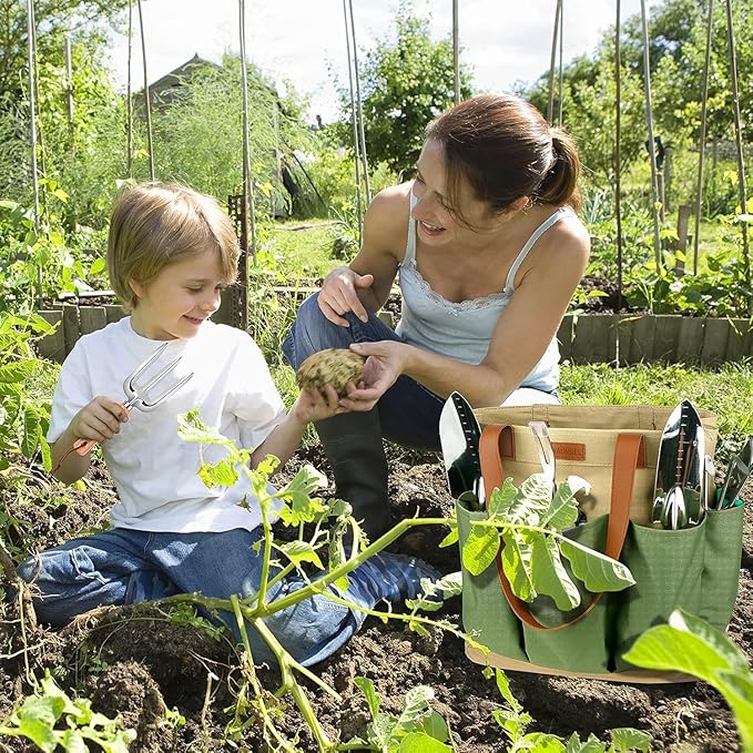 - Cover All You Need - 10 pieces garden tool kit has a handy tote bag, pruning shear, garden trowel, transplanter, weeder, hand fork, hand rake, kneeling pad, sprayer, garden gloves. All the gardening supplies are made of safe, non-toxic and harmless materials.