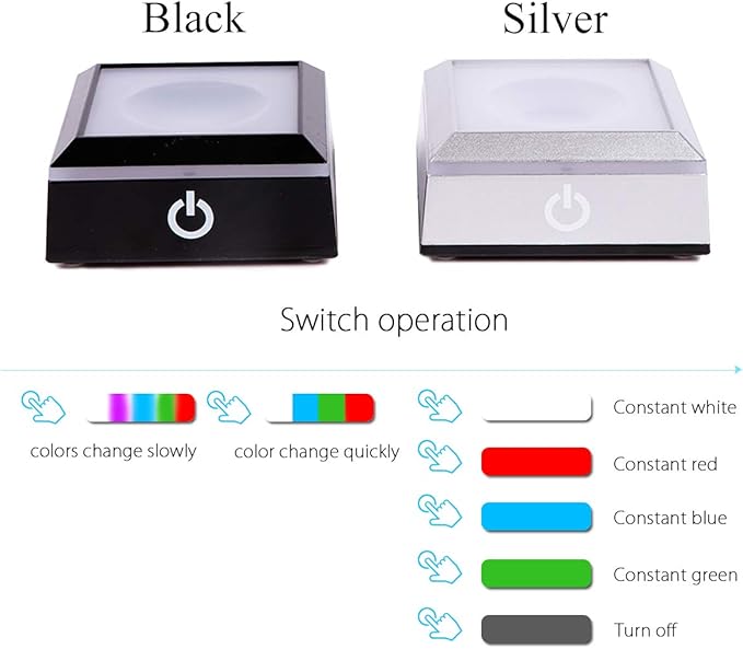 - Led Colorful Light Base: Six Lighting Modes: (Slow Flashing Multi-Coloured; Fast Flashing Multi-Coloured; Constant White Light,Red Light,Blue Light and Green Light). Light the crystal in various colors.