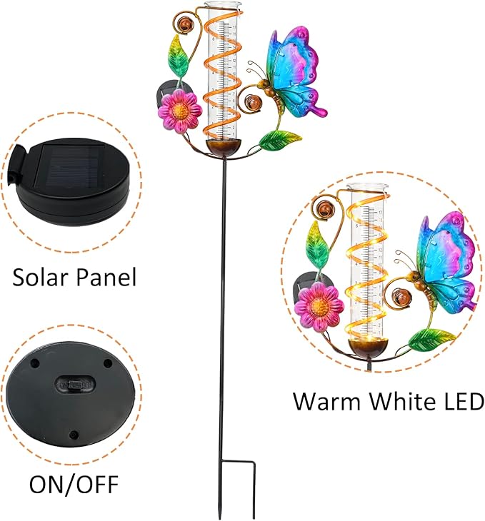 - Widely Use: The rain gauge outdoor designed with a butterfly, flower and leaves, not only can be used in measuring rainfall, but also can be used in the garden as a garden stake decoration. It measures rainfall and lights up at night to add extra visibility and style to your garden or yard.