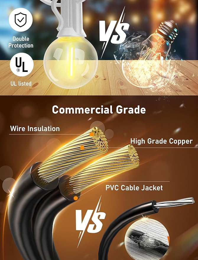 - [Waterproof & Shatterproof] G40 waterproof string lights have fully sealed and self-sealing sockets to withstand extreme temperatures. G40 led bulbs are made of plastic and are more shatterproof than traditional glass bulbs. One bulb doesn't work or goes out, it doesn't affect other bulbs.