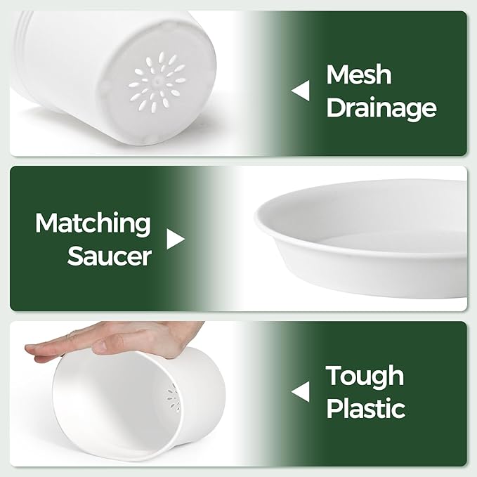 - | Excellent Drainage System | - Multiple mesh drainage holes at the bottom of these 5 inch plant pots make excellent air and water flow, which can protect the health of roots and avoid drowning. Super air permeability and water drainage can prolong the life of your carefully cultivated plants. Also, the saucers can help hold the excess water.