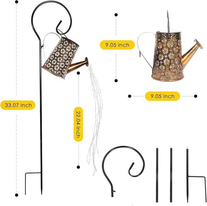 - Unique decoration : Solar Watering Can light with fairy string lights, LED copper string lights can be easily bent and shaped as you like, emitting warm yellow lights, looking like pouring water from a watering can, and projecting beautiful patterns on the ground, to create a romantic atmosphere. It is the ideal garden decor for the outside, garden, patio, Lawn Driveway Yards Backyard Pathway.