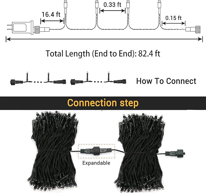- 【Safe to Use & Easy to Install】UL Listed Plug ensure your safety. Step1-Place or hang the Led Halloween fairy lights on trees, bushes, grass or any other occasions in seconds to finish your decoration. Step2-Plug the transformer into the main supply and power the purple string lights on, then you can choose the mode by the button on the power adapter. End to end connectable, up to 5 sets (Total Length: 328ft), long enough to meet your creative lighting decor needs