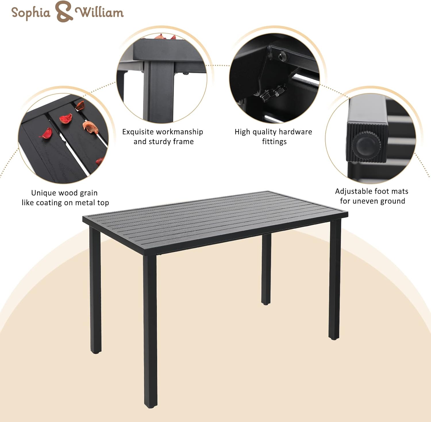 - Easy to Assemble: Our outdoor metal furniture set is easy to assemble with detailed installation manuals and complete accessories. Easy to clean with damp cloth and resistant to dirt and abrasion. Table Dimension: 55.9”L x 29.5”W x37”H, Chairs Dimension: 20”W x 21’’D x 46.5"H, Weight Capacity: 300lbs