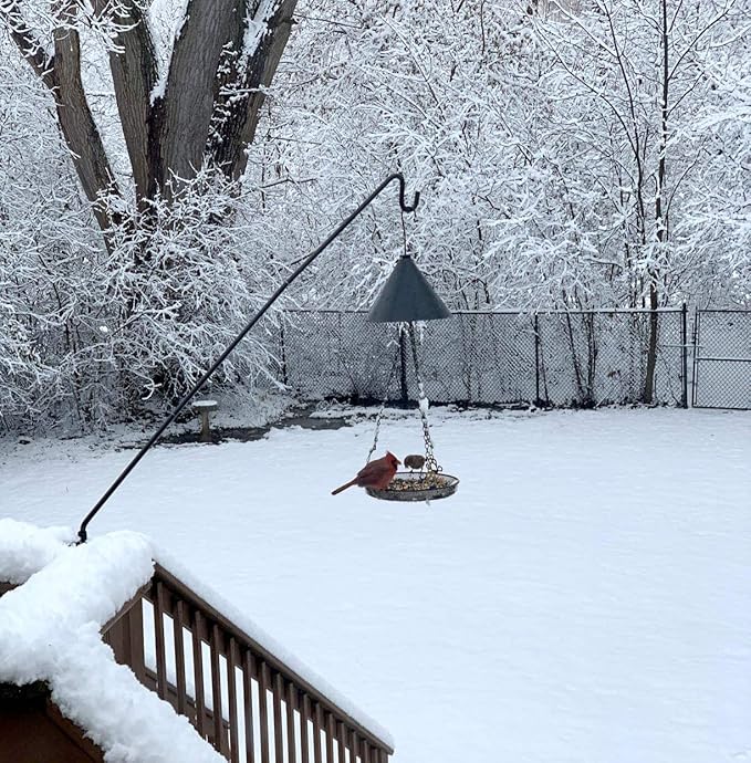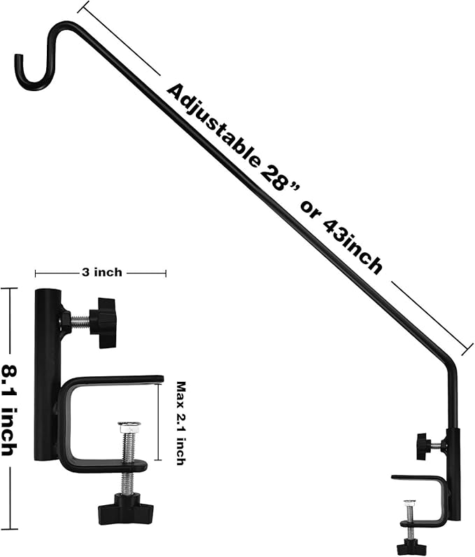 - SMART DESIGN and SIZE -- 43 inch bird feeder pole, a longer distance guard against squirrels and other animals from stealing birds' seeds. Things like bird droppings and seeds all fall off the deck, making it easier for you to clean up.Our smart design is hook pole length adjustable 28inches or 43 inches and the pole direction can be adjusted by 360 degree. Our deck hook for bird feeder is a good outdoor and indoor decorative products.