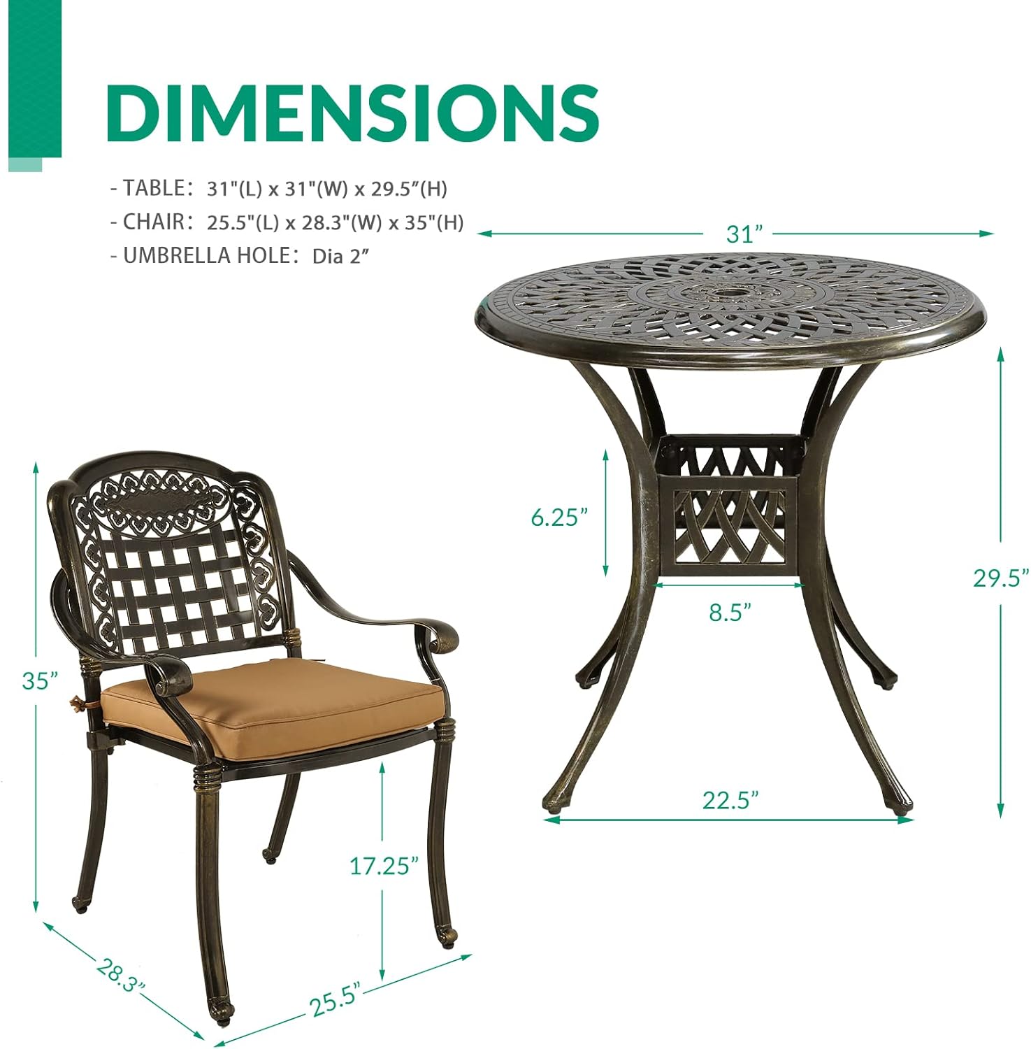- 【SET DIMENSIONS】 - Table Dimensions: Dia31"x 29.5”(H); Chair Dimensions: 25.5"(L) x 28.3"(W) x 35"(H); Cushion Dimensions: 19"(L) x 19"(W) x 2.8"(H); Umbrella hole: Dia 2"; Weight Capacity of Table: 165 lbs; Weight Capacity of Each Chair: 350 lbs.