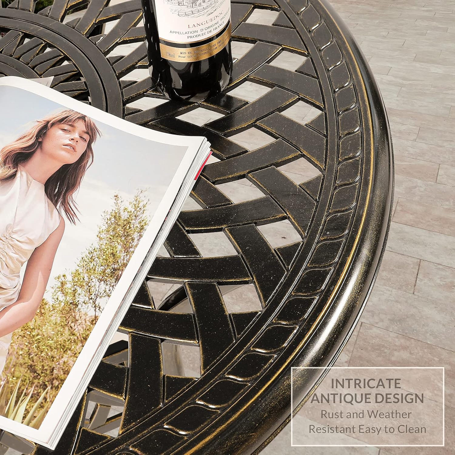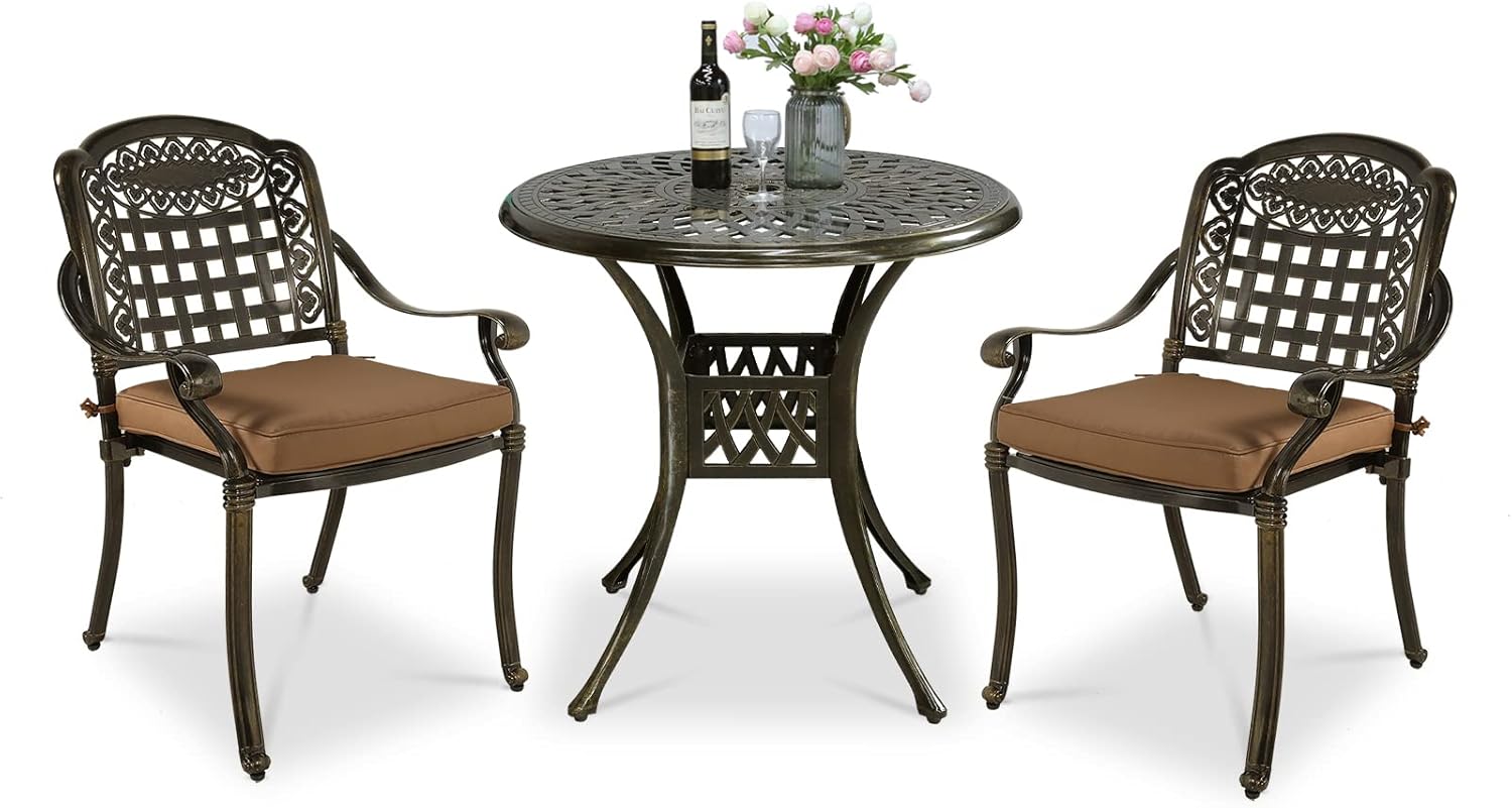 - 【STYLISH APPEARANCE】 - This 3-Piece Dining Set includes 2 stylish and comfortable chairs and 31" round cast table. Elegant cast accents scroll across the chairs and table top, adding a level of sophistication and craftsmanship to the collection. Perfect addition to your patio, yard, deck, or porch.