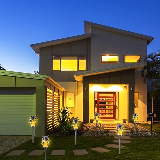 - Easy Installation & Auto On/Off: Solar powered outdoor lights no wiring required, place the outdoor lights on your Lawn, Garden, Flower Bed, Yard, Patio, and Pathways. No electric need; environmentally friendly tiki torches for outside support Auto ON/OFF switch from Dusk to Dawn.