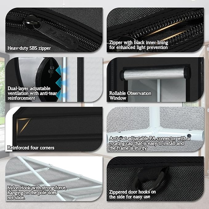 - Easy to Observe---Our easy-access door unzips smoothly, Grow tent with observation window makes it easy and comfortable to peek inside and helps you to monitor your plants anytime.