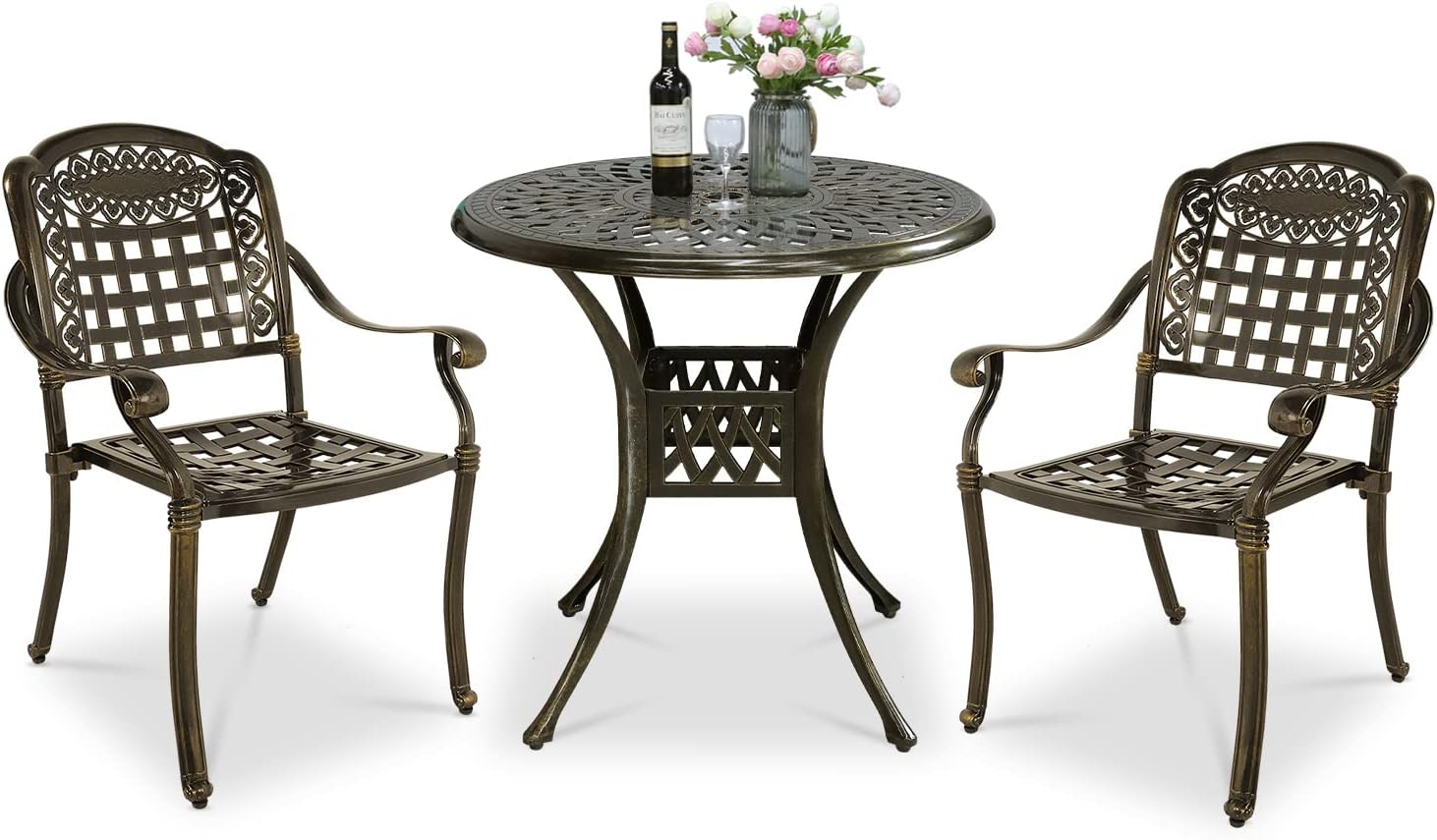 - 【STYLISH APPEARANCE】 - This 3-Piece Dining Set includes 2 stylish and comfortable chairs and 31" round cast table. Elegant cast accents scroll across the chairs and table top, adding a level of sophistication and craftsmanship to the collection. Perfect addition to your patio, yard, deck, or porch.
