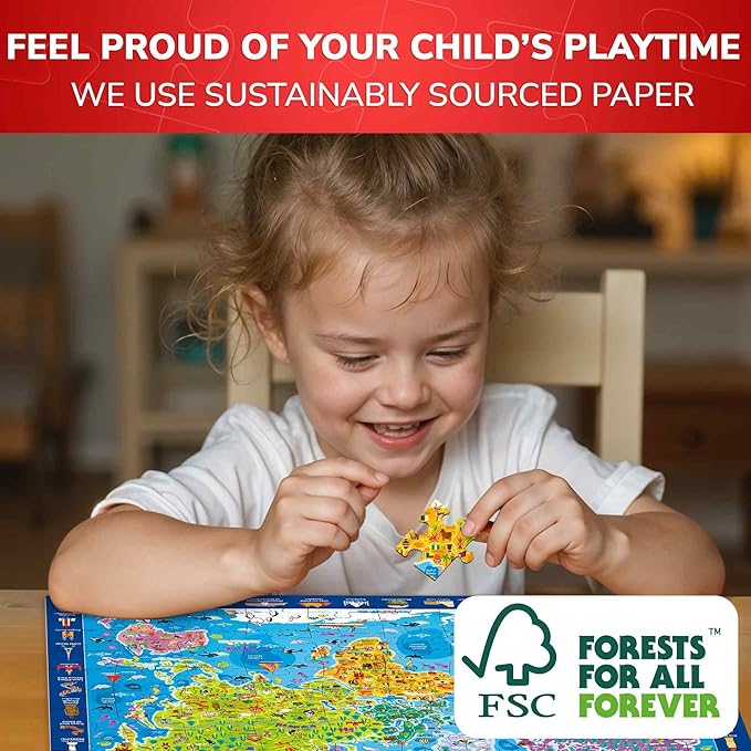 - MAP OF THE WORLD PUZZLE FOR KIDS: our set of 3 big floor puzzles for kids ages 8-10 help children learn all countries, flags, states, waterfalls, and mountains; Finished puzzles size 26"L x 20"W; Every puzzle piece is unique