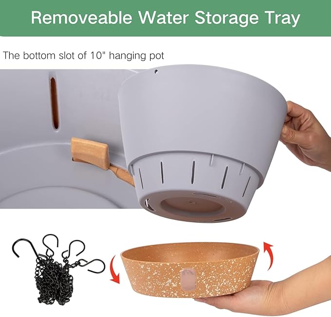 - SNAP-IN TRAY & WATER STORAGE: Snap-in tray is convenient to clean hanging plant pot. Hanging pots can overflow excess water from the edge, and the tray will store 7-14 days water for plants