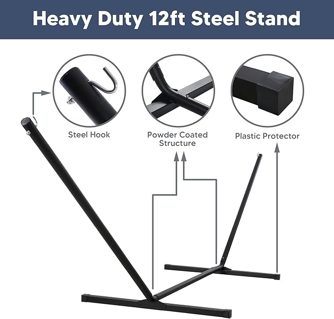 - Hammock with Portable Stand: No damage to trees. Created to be stable and long-lasting, the 12 ft stand is made from powder-coated heavy gauge steel. It can be easily assembled in minutes without any tools, and it could be disassembled easily, making it to be a portable hammock. Feel free to contact us if you have any questions during use within one year of purchase. We are always here to help