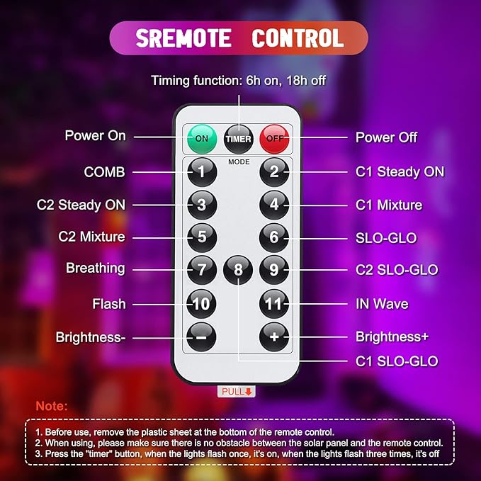 - Convenient Remote Control: Turn lights on/off, adjust brightness, switch modes, and set timing functions from a distance.