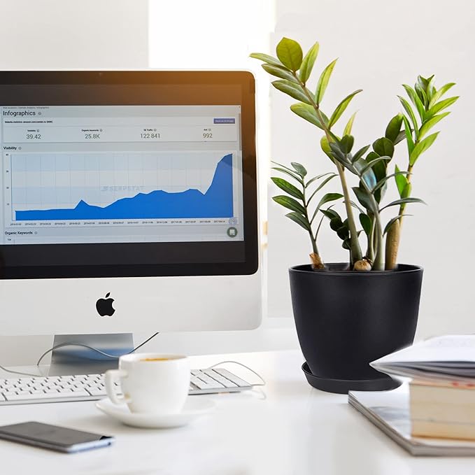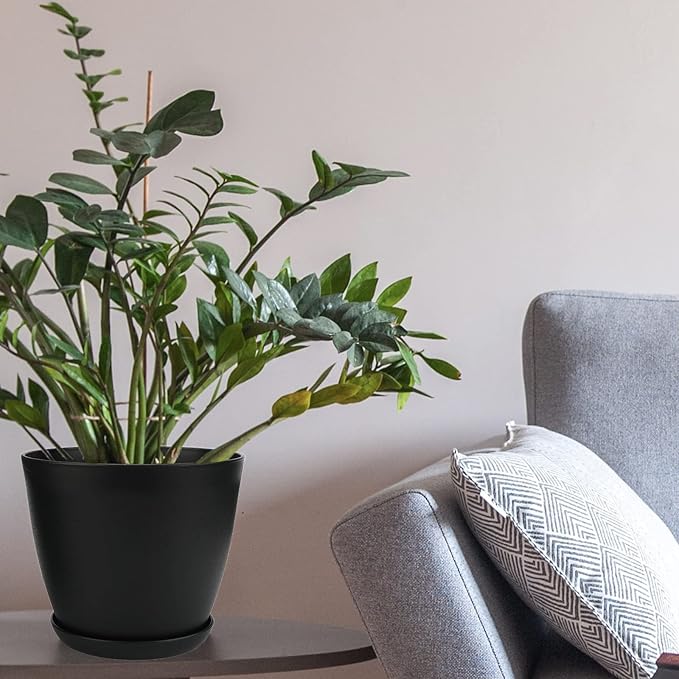 Plant Pots, 12 Pack 6 inch Modern Plastic Planters with Drainage Holes and Saucers for Indoor Outdoor Plants and Flowers, Black