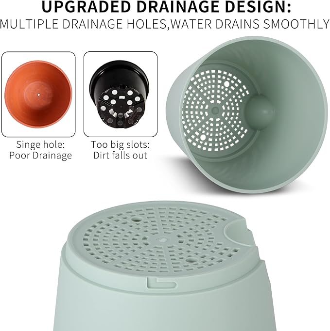 - 【Excellent Drainage Holes and Watering Lip】These flower pots for plants come with multiple drainage holes in the bottom. The holes and watering lip provide an air circulation system for the plant roots, which greatly reduces the problem of root rot of plants in a closed environment. The independent watering lip replenishes water for plants, so that water does not have to pass through the plant itself, At the same time, it is convenient to observe the current water level.