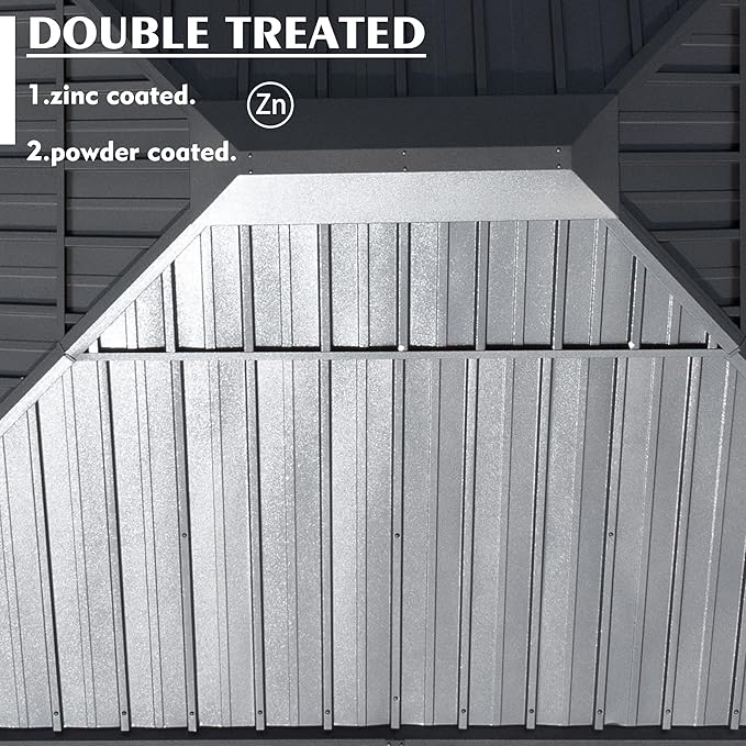 - ✅Metal Canopy/Roof and Gutter Design - The metal canopy of this gazebo ensures longevity and durability. Its roof, made of sheet metal, boasts a robust 29-gauge thickness, which is thicker than most gazebos on the market. its water gutter system ensures that rainwater is efficiently directed away from the edges of the frame and poles.