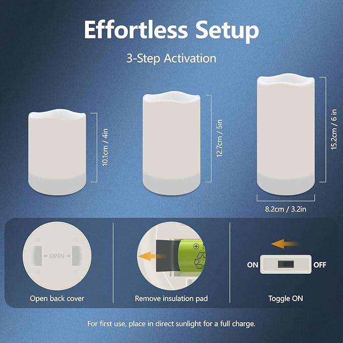 - SOLAR POWERED: Light up your night with dusk-to-dawn candles These classic pillars turn on automatically at nightfall and stay on for 10+ hours. [Rechargeable batteries included]